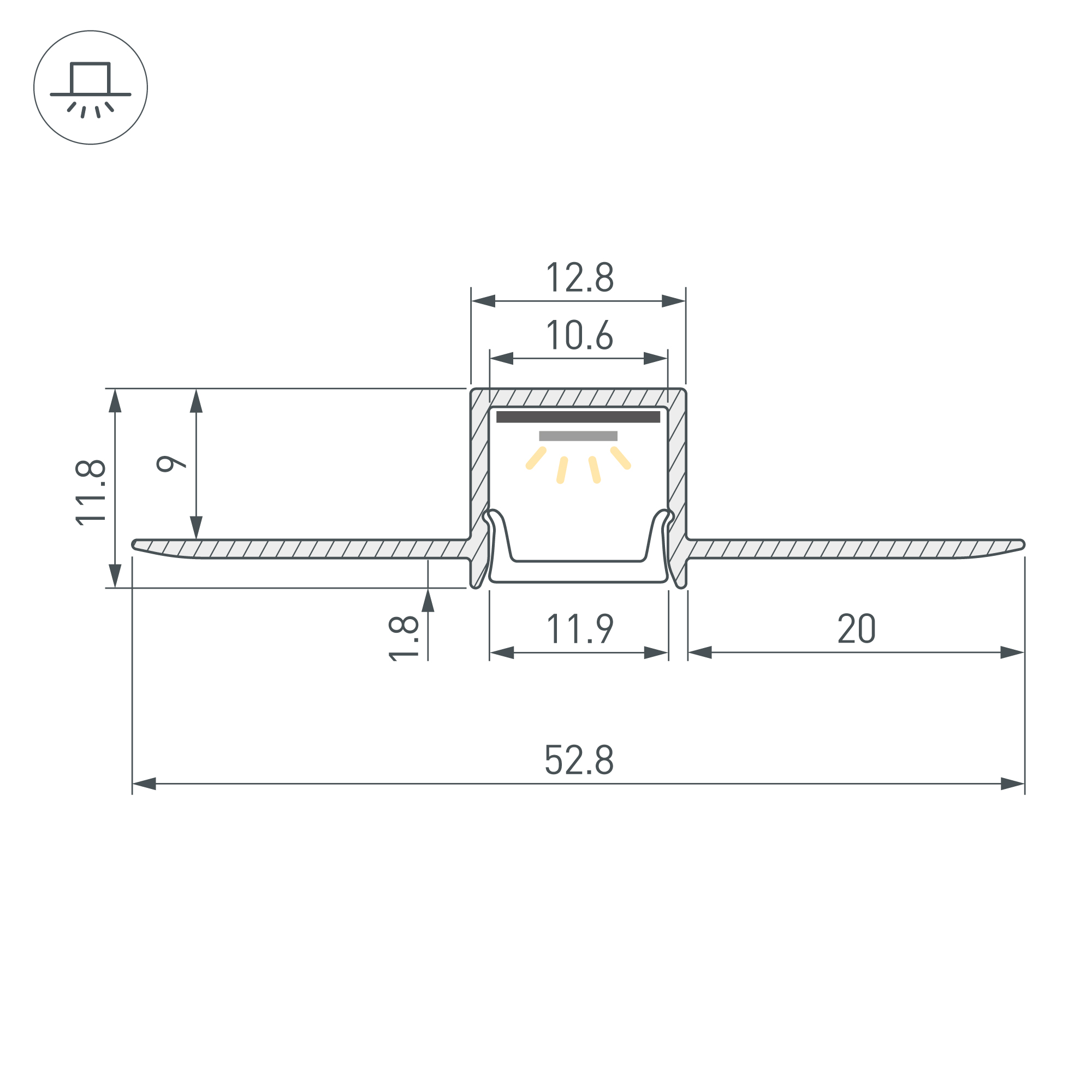 Алюминиевый встраиваемый профиль для светодиодных лент и линеек. Габаритные размеры (L×W×H): 2000х52,8х11,8 мм. Ширина площадки для ленты 10,6 мм. Экраны, заглушки и другие аксессуары приобретаются отдельно. Цена за 1 метр.
