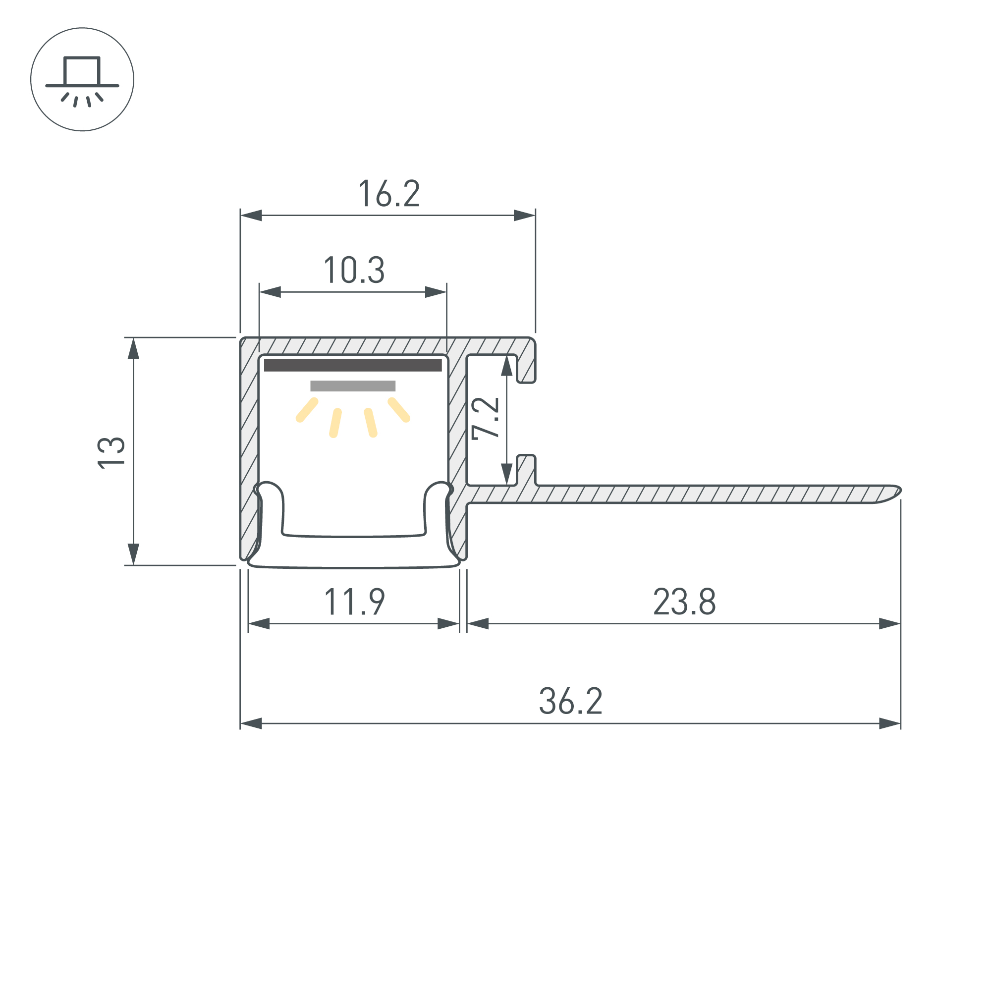 Алюминиевый встраиваемый гибкий профиль для светодиодных лент и линеек. Изгиб вверх/вниз. Минимальный радиус изгиба 20 см. Габаритные размеры (L×W×H): 2000х36,2х13 мм. Ширина площадки для ленты 10,3 мм. Экраны, заглушки и другие аксессуары приобретаются отдельно. Цена за 1 метр.
