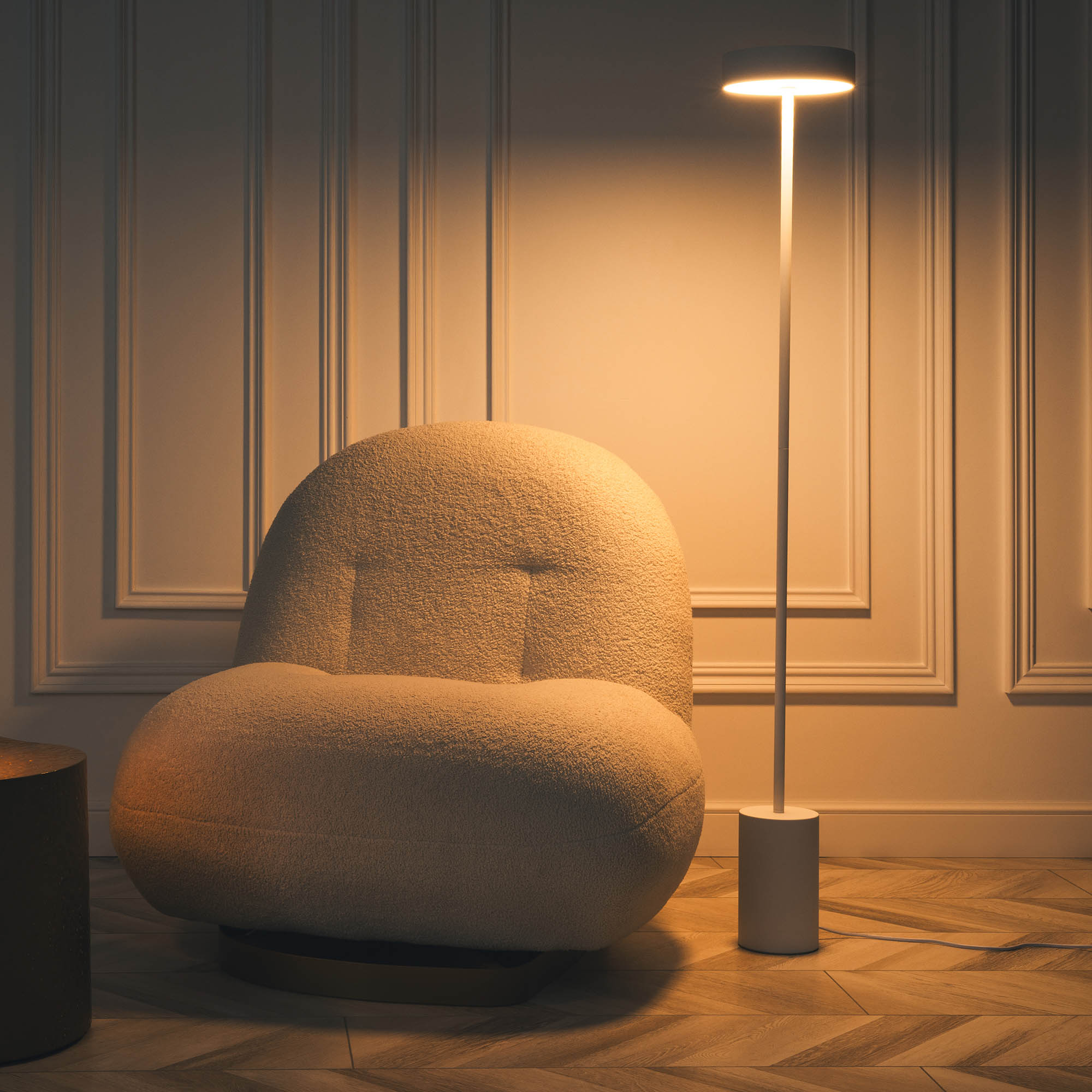 Декоративный напольный светильник. Мощность 16 Вт, св. поток 1230 лм, 76 лм/Вт, теплый 3000 K, CRI>90, угол 110 °. Фигурный корпус из стали белого цвета, матовый экран PMMA, степень защиты IP20. Размер светоизлучателя: Ø200х54 мм; размер основания: Ø120 x 200 мм; размер ножки: Ø16,4 x 1100 мм; общая высота: 1354 мм. Пульсация < 2%. Длина провода 2400 мм, питание от сети AC 220-240V.