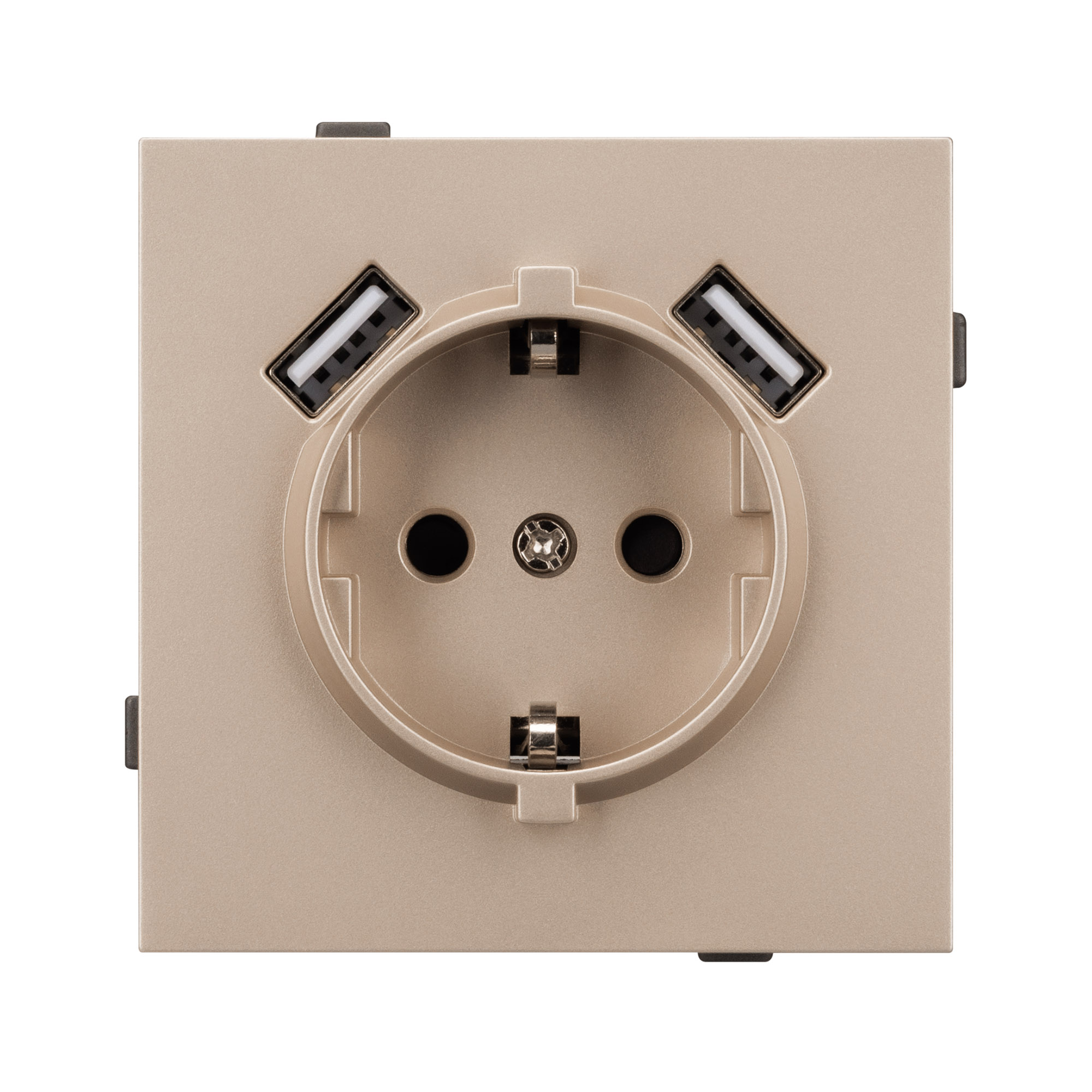 Механизм розетки с заземлением на 1 пост и 2USB Type A порта. Цвет - золотой. Без фронтальной рамки. Уровень пылевлагозащиты IP20. Розетка устанавливается в стандартный подрозетник круглого сечения диаметром 60мм.