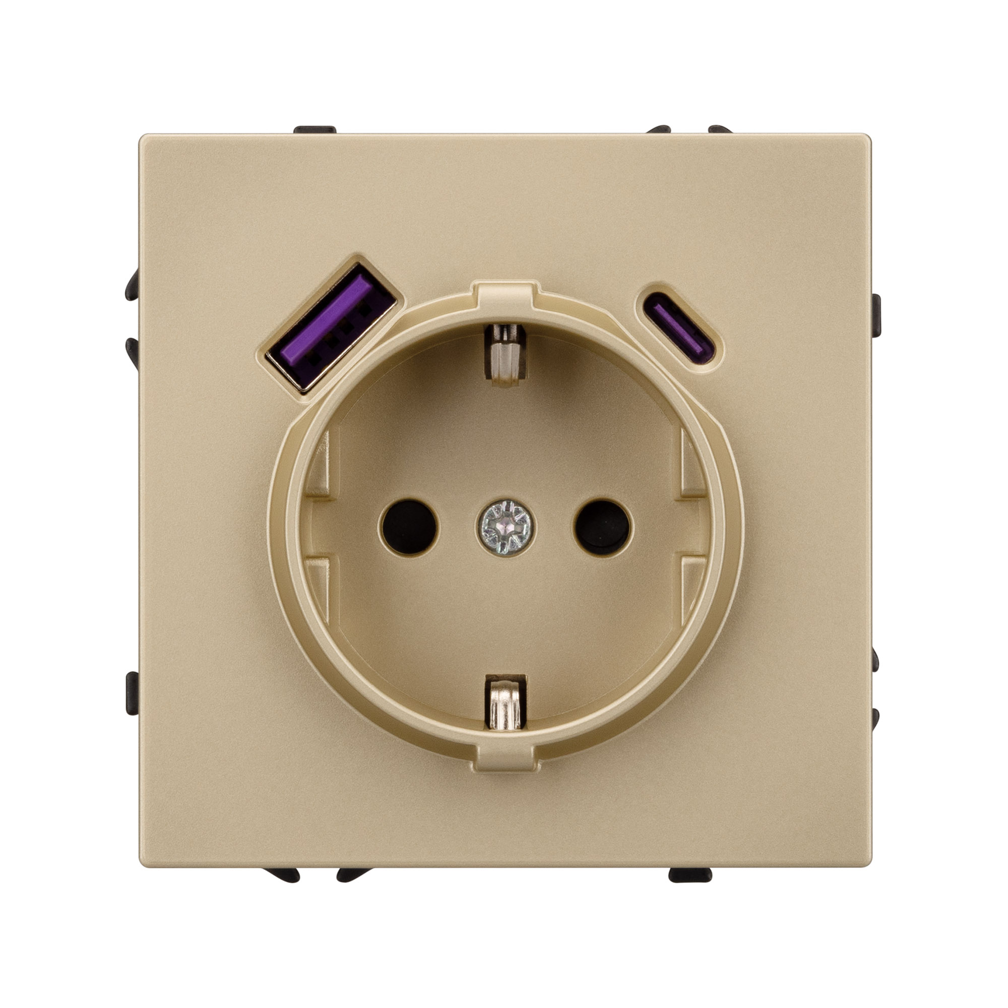 Механизм розетки с заземлением 1 пост и 2 USB Type A+C порта. Цвет - золотой, с Soft-Touch покрытием. Без фронтальной рамки. Уровень пылевлагозащиты IP20. Розетка устанавливается в стандартный подрозетник круглого сечения диаметром 60мм. Габаритные размеры: длина 71 мм, ширина 71 мм, высота 53 мм. Гарантийный срок 10 лет.
