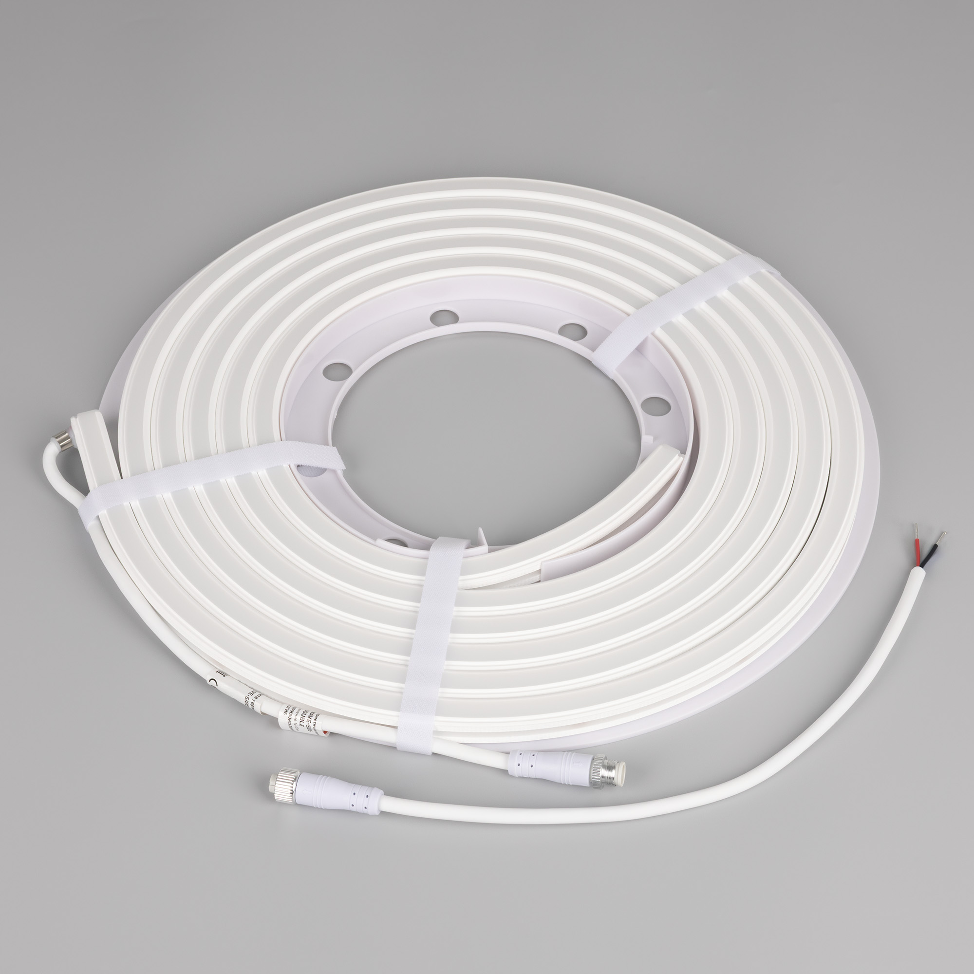 Гибкая герметичная лента (неон серии WAVE), сечение 16×15 мм. Светодиоды SMD2835 120 шт/м. Цвет свечения ДНЕВНОЙ (4000 К), индекс цветопередачи CRI>90, световой поток 638 лм/м, угол излучения 292°. Мощность 15 Вт/м, питание 24 В. Класс пылевлагозащиты IP67. Размеры 5000×16×15 мм. Мин. отрезок 50 мм. Горизонтальный изгиб SIDE, свечение в две стороны, минимальный радиус изгиба 100 мм. Вывод кабеля с одной стороны перпендикулярно линии сечения неона. Катушка 5 м. Цена за 1 м. Гарантия 5 лет.
