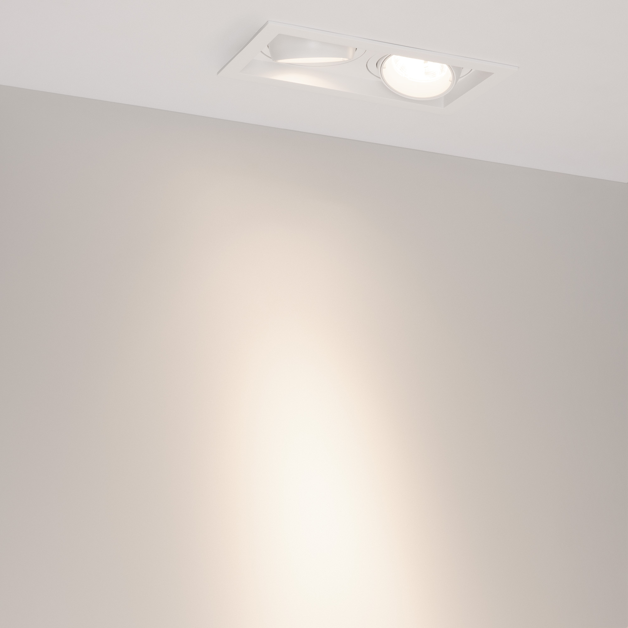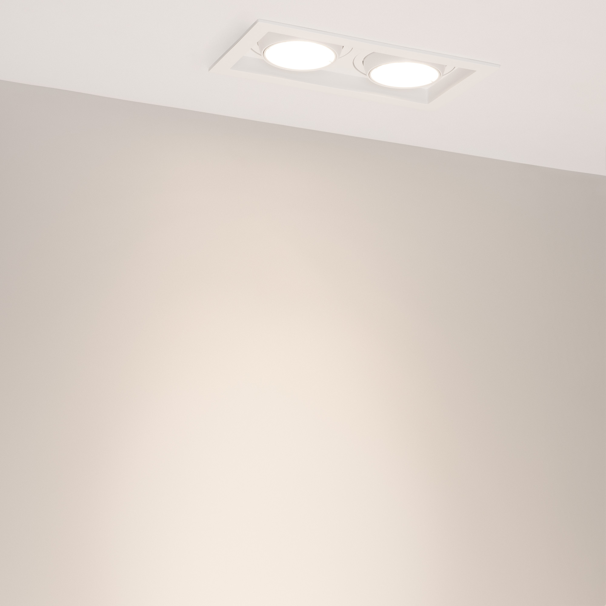 Встраиваемый карданный светильник. Мощность 2х20 Вт, св. поток 4134 лм, 103 лм/Вт, дневной 4000 K, CRI>92, угол 20°, напряжение питания 230 В. Белый корпус из алюминия, черная вставка, степень защиты IP20. Размер: длина 210 мм, ширина 117 мм, высота 105 мм. Монтаж встраиваемый, установочное отверстие: длина 190 мм, ширина 95 мм. Драйвер 24-42 В, 500 мА, пульсация <2%.