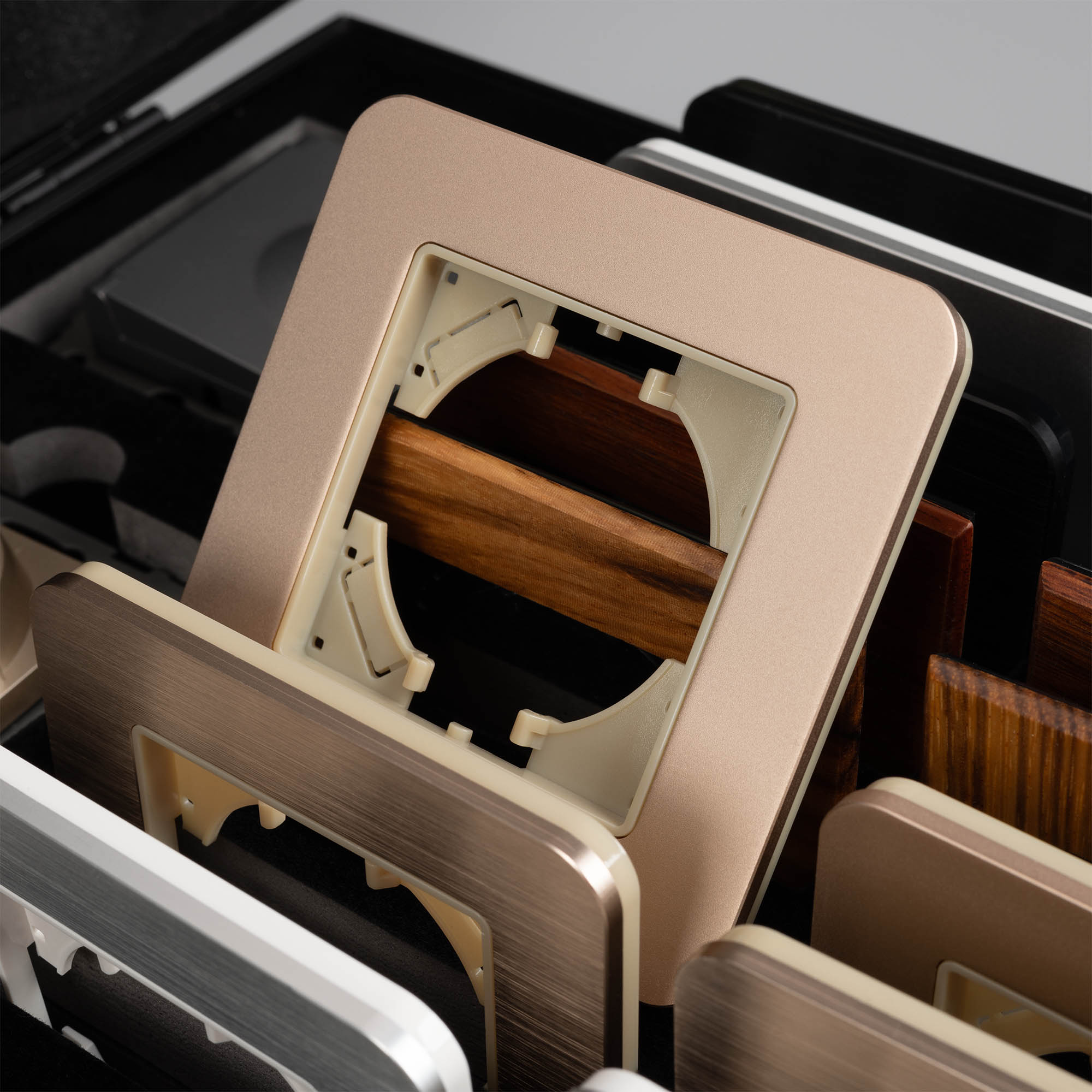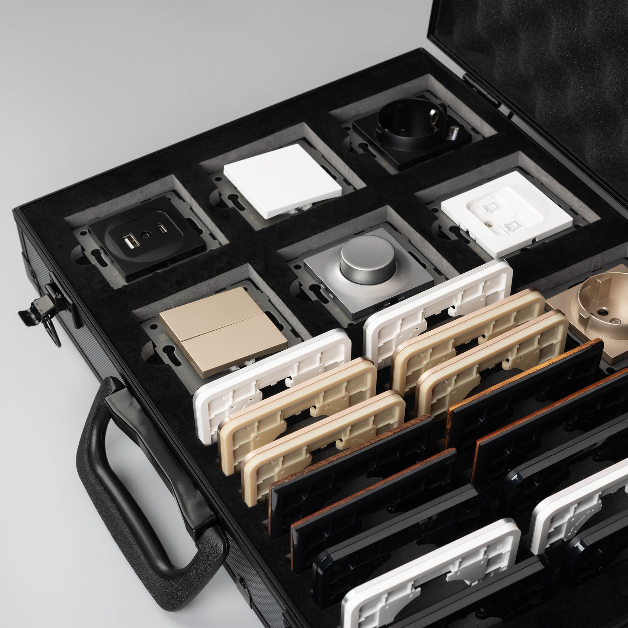 Демо-кейс с наполнением электроустановочных изделий серий AKIRY, XSILO и сопутствующих механизмов.