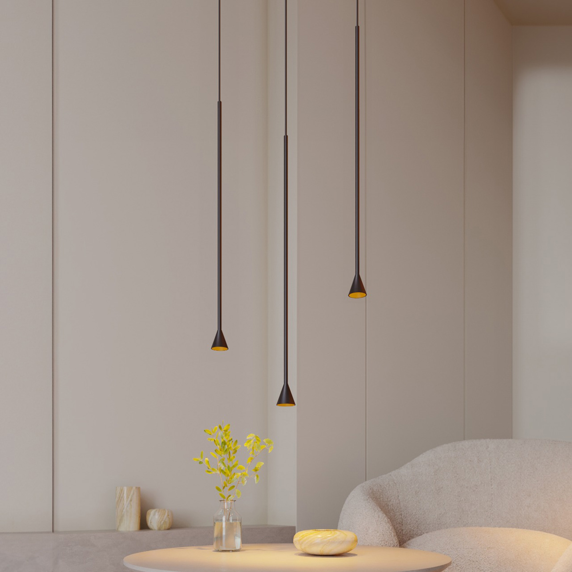 Подвесной светильник. Мощность 5 Вт, св. поток 440лм, 88 лм/Вт, теплый 3000 K, CRI>94, угол 36°, напряжение питания 230 В. Черный корпус из алюминия с конусообразным излучателем, линза-рассеиватель из PMMA, степень защиты IP20. Размер: длина ножки 500 мм, диаметр ножки 10 мм, высота светоизлучателя 63 мм, диаметр светоизлучателя 50 мм. Монтаж подвесной, длина подвеса 1500 мм, регулируемая. В комплекте 2 вида чаш. Габариты чаши (встраиваемая) Ø70 х 35 мм, врезное отверстие Ø60 мм. Габариты чаши (накладная) Ø100 x 40 мм. Драйвер 6-13 В, 500 мА, пульсация <1%.