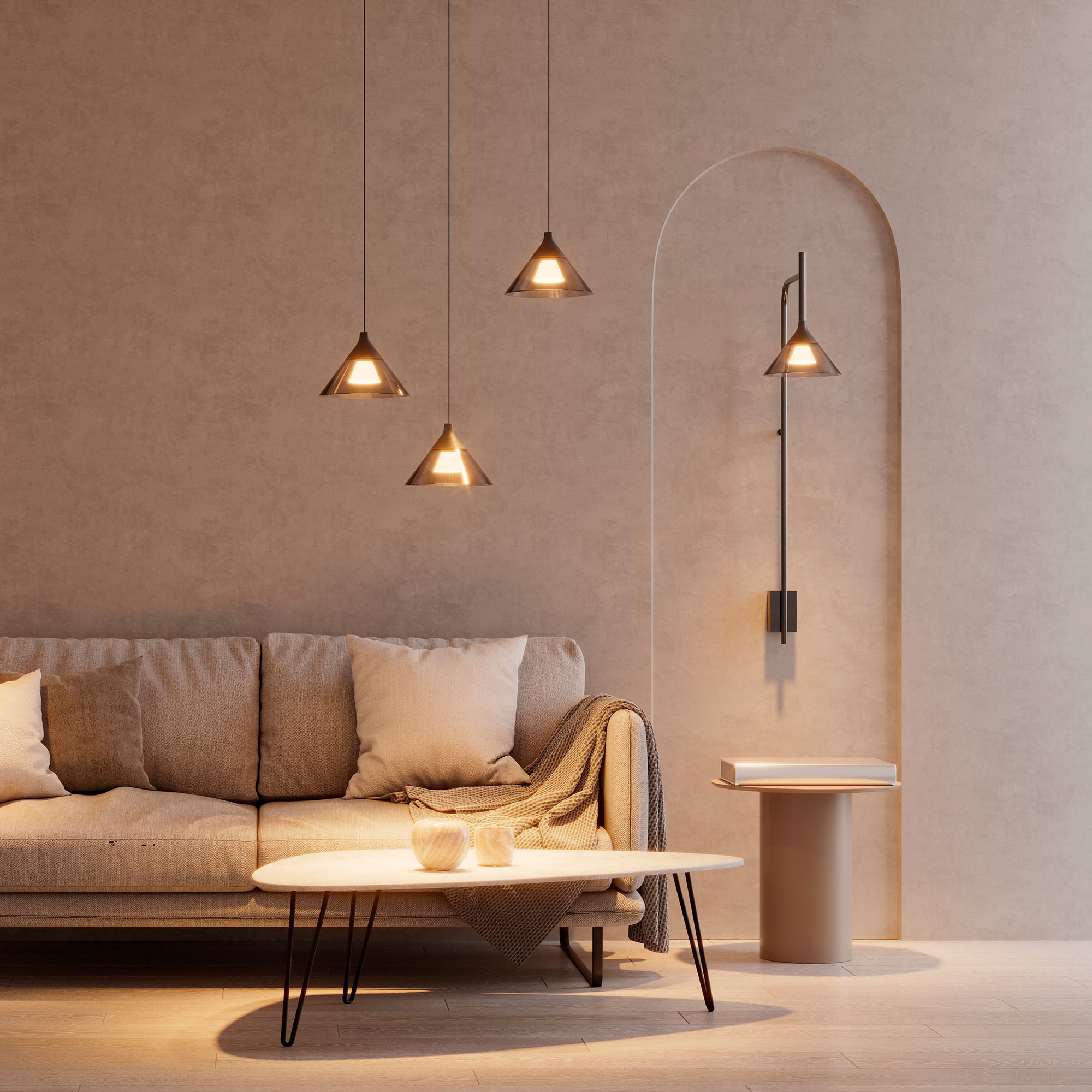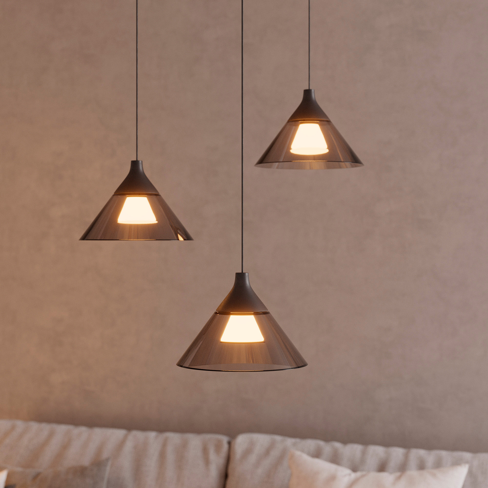 Подвесной светильник. Мощность 7 Вт, св. поток 355 лм, 50 лм/Вт, теплый 3000К, CRI>94, угол 30°, напряжение питания 230 В. Черный корпус из алюминия с конусообразным стеклянным плафоном дымчатого цвета, степень защиты IP20. Размер: диаметр плафона 200 мм, высота плафона 180 мм. Монтаж подвесной, длина подвеса 1500 мм, регулируемая. Габариты чаши (накладная) Ø75 x 120 мм. Драйвер 25-40 В, 150 мА, пульсация <1%.