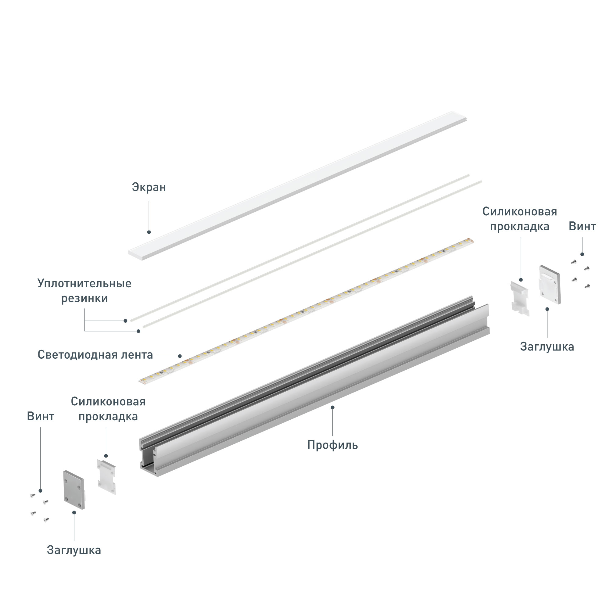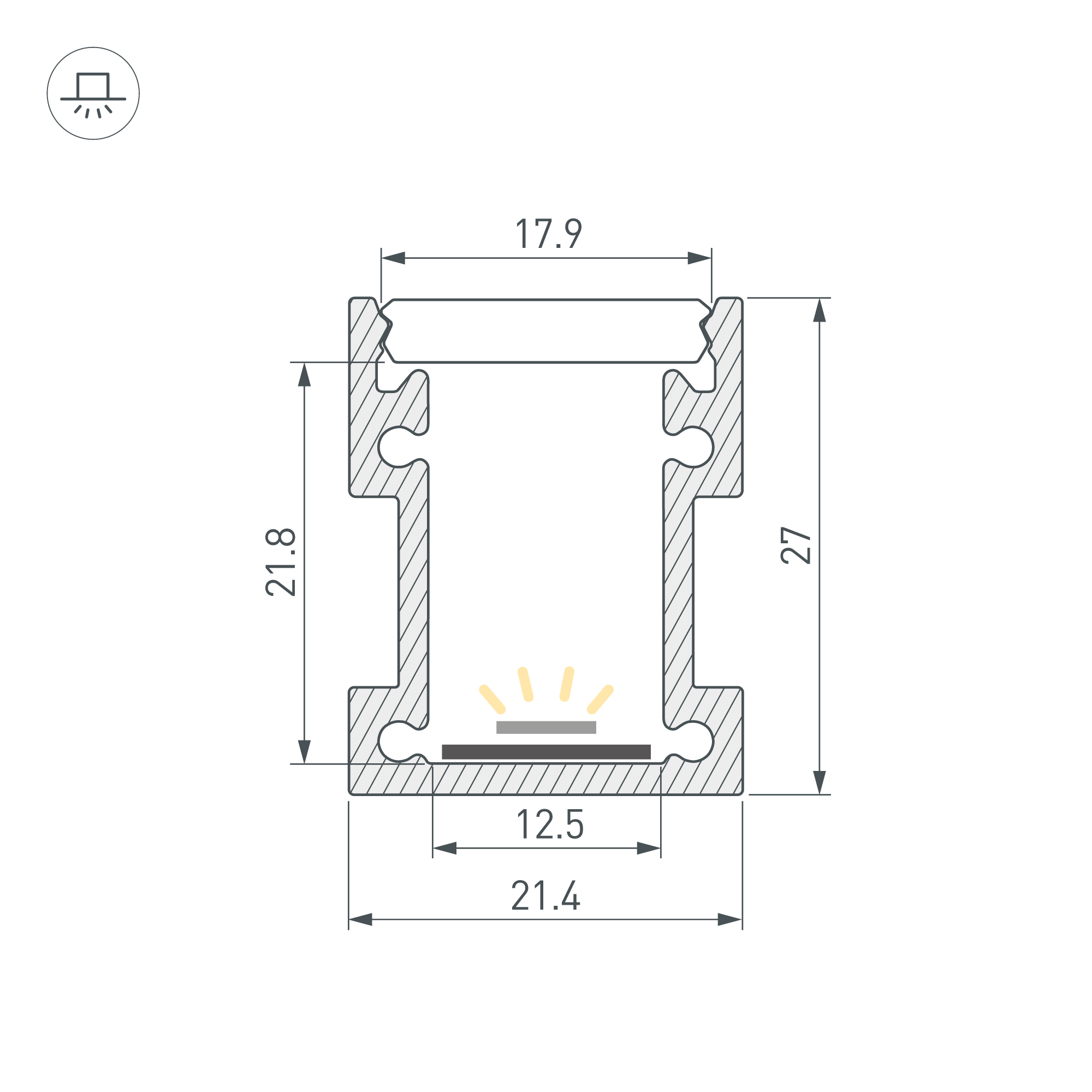 Алюминиевый анодированный профиль. Возможность герметизации до IP65 (при использовании силиконового клея для фиксации экрана и заглушек), IK10 (08-10). Габаритные размеры (L×W×H): 2000x21,4x27 мм. Ширина площадки для ленты 12,5 мм. Заглушки и другие аксессуары приобретаются отдельно. Цена за 1 метр.