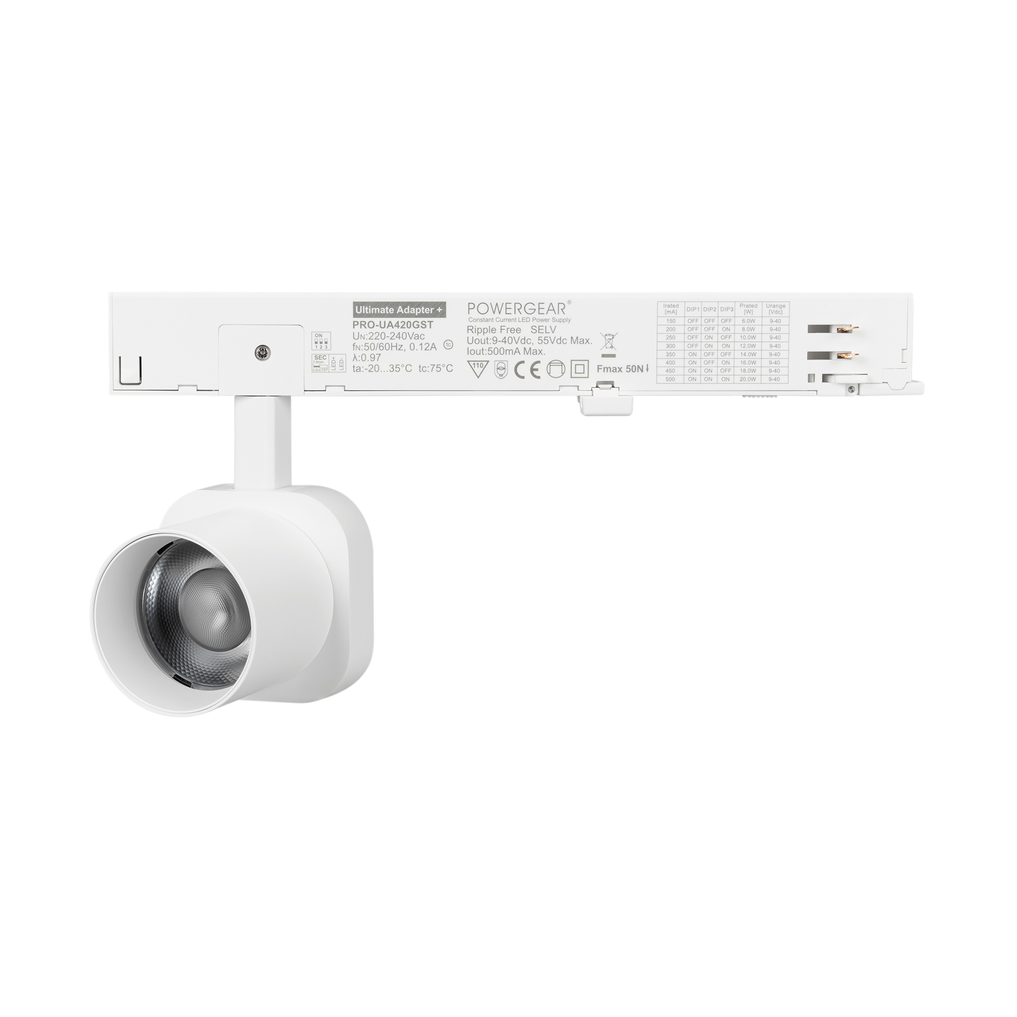 Светильник для треков/шин 4 провода. Мощность 10 Вт, св. поток 860 лм, 86 лм/Вт, дневной 4000 K, CRI>95, угол 38°, напряжение питания 230 В. Решетка HONEYCOMB в комплекте. Белый квадратный корпус из алюминия, материал линзы PC поликарбонат, степень защиты IP20. Размер световой части 60х60х62 мм. Монтаж на трек 3-фазный. Драйвер встроенный 9-40 В, 250мА., пульсация <1%