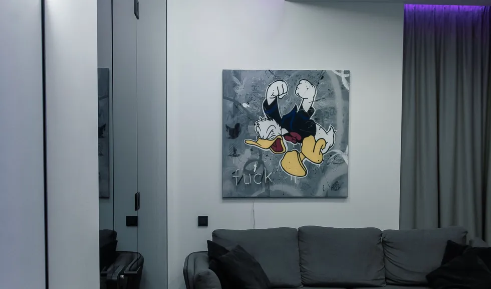 Основу интерьера частной квартиры составляет насыщенная серая цветовая гамма — от глубокого графитового оттенка до «лофтового» металлика. Пол теплого древесного цвета вносит в холодную монохромность ощущение уюта, а яркие цветные детали оживляют пространство. Картина с мультяшным героем, оригинальные текстуры и цветная подсветка создают в пространстве жизнерадостную и неформальную атмосферу.