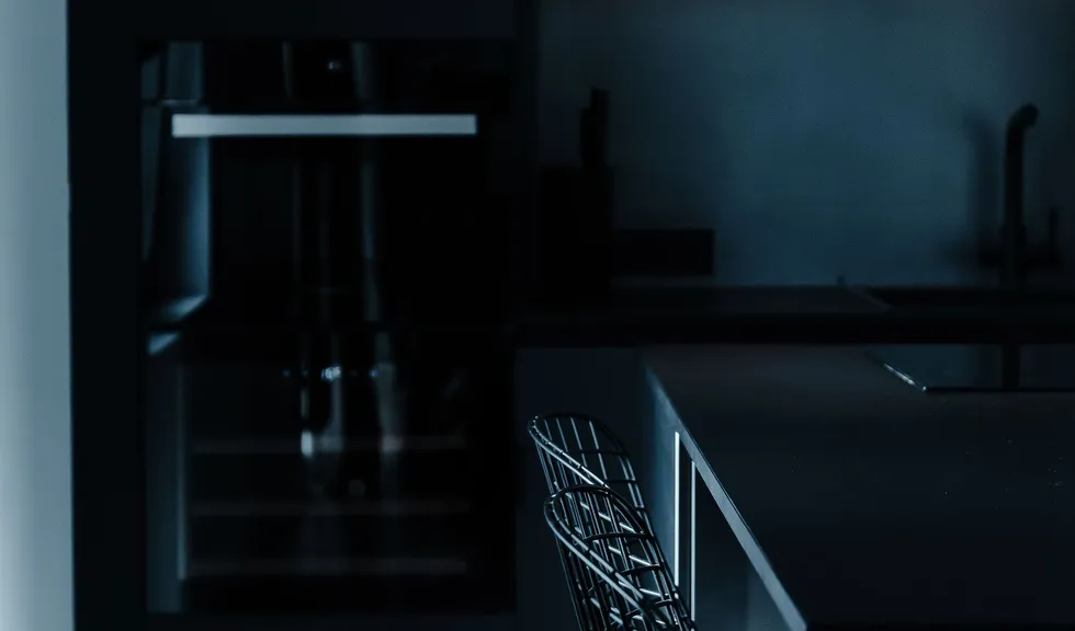 В гостиной парящий потолок гармонично соседствует с частью бетонного потолка без отделки. Подсветка стильного фиолетового свечения привносит свежесть и становится ярким акцентом в интерьере. Говоря об остальных источниках освещения, можно наблюдать общую концепцию лаконичности. Аккуратная акцентная подсветка теплого белого свечения разбавляет холодную цветовую гамму в интерьере.