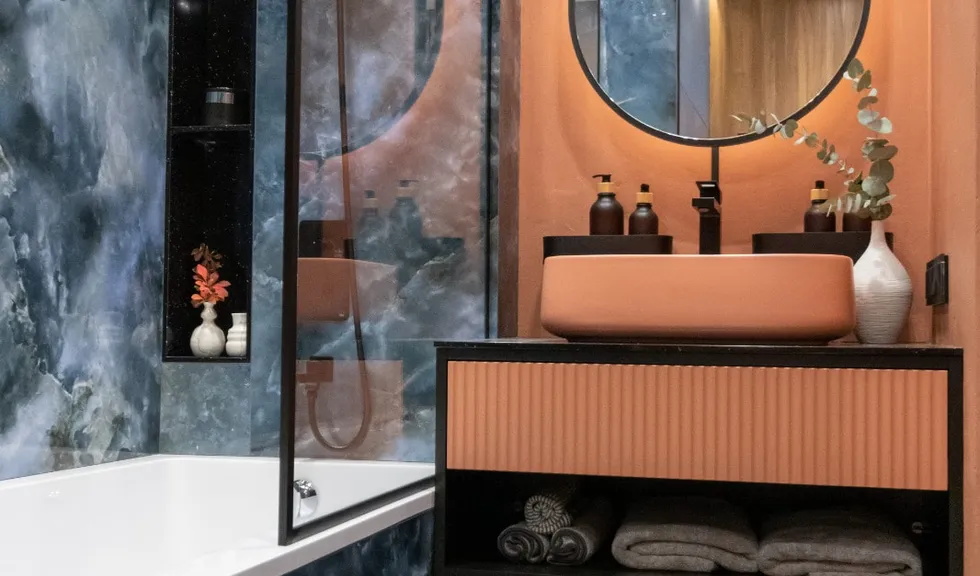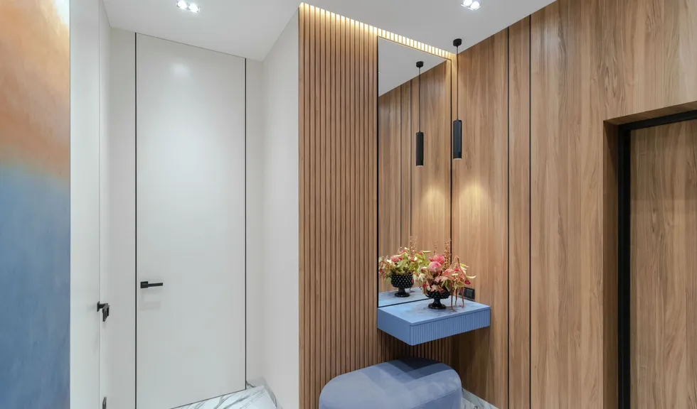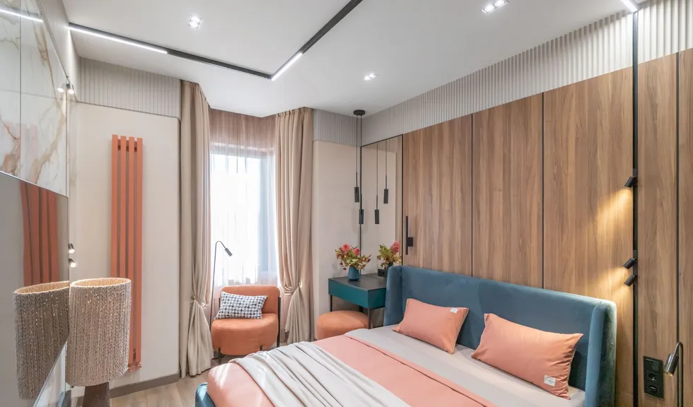 Интерьер компактной квартиры в ЖК «ЗИЛАРТ» построен на сочетании жизнерадостного персикового цвета и элегантных синих оттенков. Благодаря такой контрастной цветовой гамме пространство не перегружено и визуально выглядит шире. В свою очередь, добиться ощущения объема и воздушности помогло грамотное зонирование с помощью различных видов источников света.