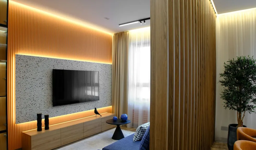 Закарнизная подсветка — один из часто применяемых приемов освещения в проекте. С помощью светодиодной ленты Arlight серии RT был создан эффект «парящего» потолка на кухне, в гостиной и коридоре, а также подсвечена декоративная плита с телевизором на стене из реек. Для создания закарнизной подсветки и эффекта «парящей» ванны в санузле была использована герметичная лента серии RTW с повышенной степенью пылевлагозащиты (IP65).
