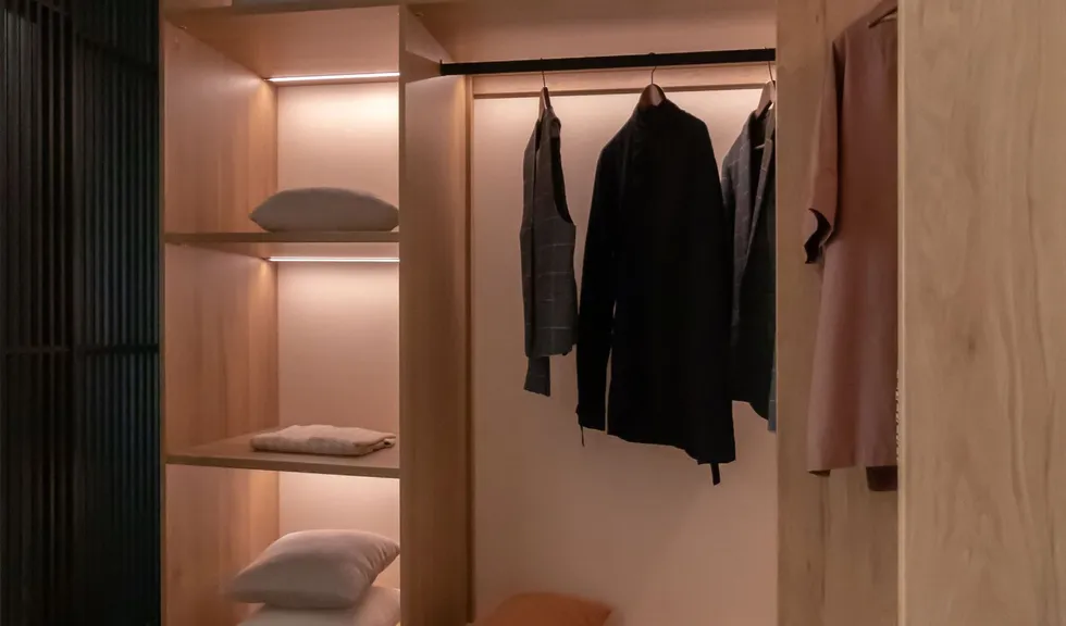 Основное освещение во всей квартире создано благодаря встроенным в потолок светильникам SIMPLE с двумя модулями. Поворотные световые модули светильников и небольшой угол излучения (45°) позволяют сделать акцент на определенной зоне комнаты и не пересветить пространство, что важно, учитывая небольшие размеры помещений. Свечение с высоким индексом цветопередачи (CRI>90) не искажает цветовую гамму интерьера.