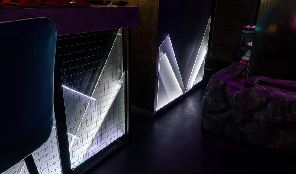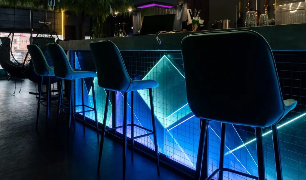Помещение выполнено в темных тонах, что создает ощущение камерности и уюта. Однако благодаря цветной подсветке кальян-бар наполняется игривыми и даже фантастическими интонациями.