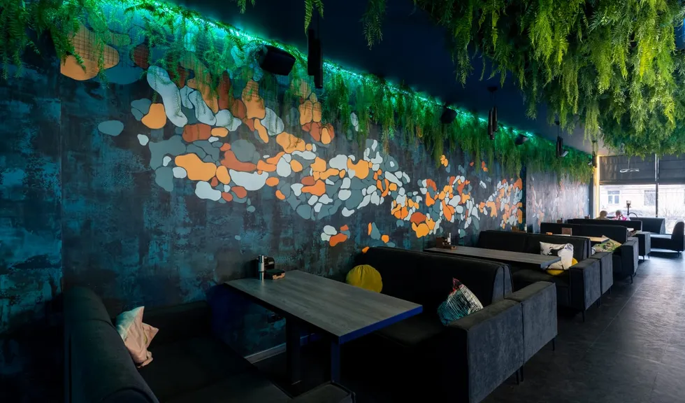 Абстрактные разноцветные пятна на одной из стен создают расслабляющее и легкое настроение. RGB-подсветка обеспечивает дополнительный акцент. Возможность выбора любого цвета свечения позволяет задать в кальянной нужное настроение.