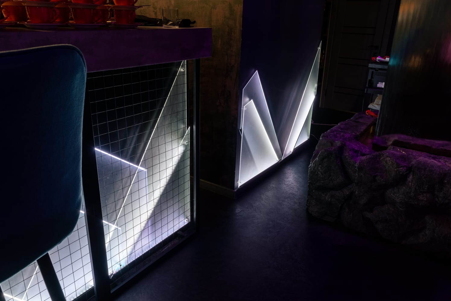 Особенно хочется отметить оформление бара. Композиция на основе светодиодных лент напоминает холодные горы, что психологически вызывает у посетителей желание попробовать напитки бара.