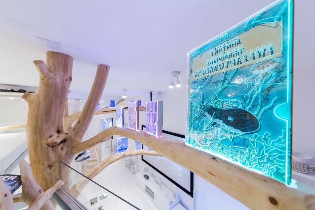 В данном проекте было широко использовано светодиодное освещение и подсветка на основе оборудования arlight®. На ветвях деревьев расположились плексигласовые ниши для книг, подсвеченные светодиодной лентой arlight® разных цветов.