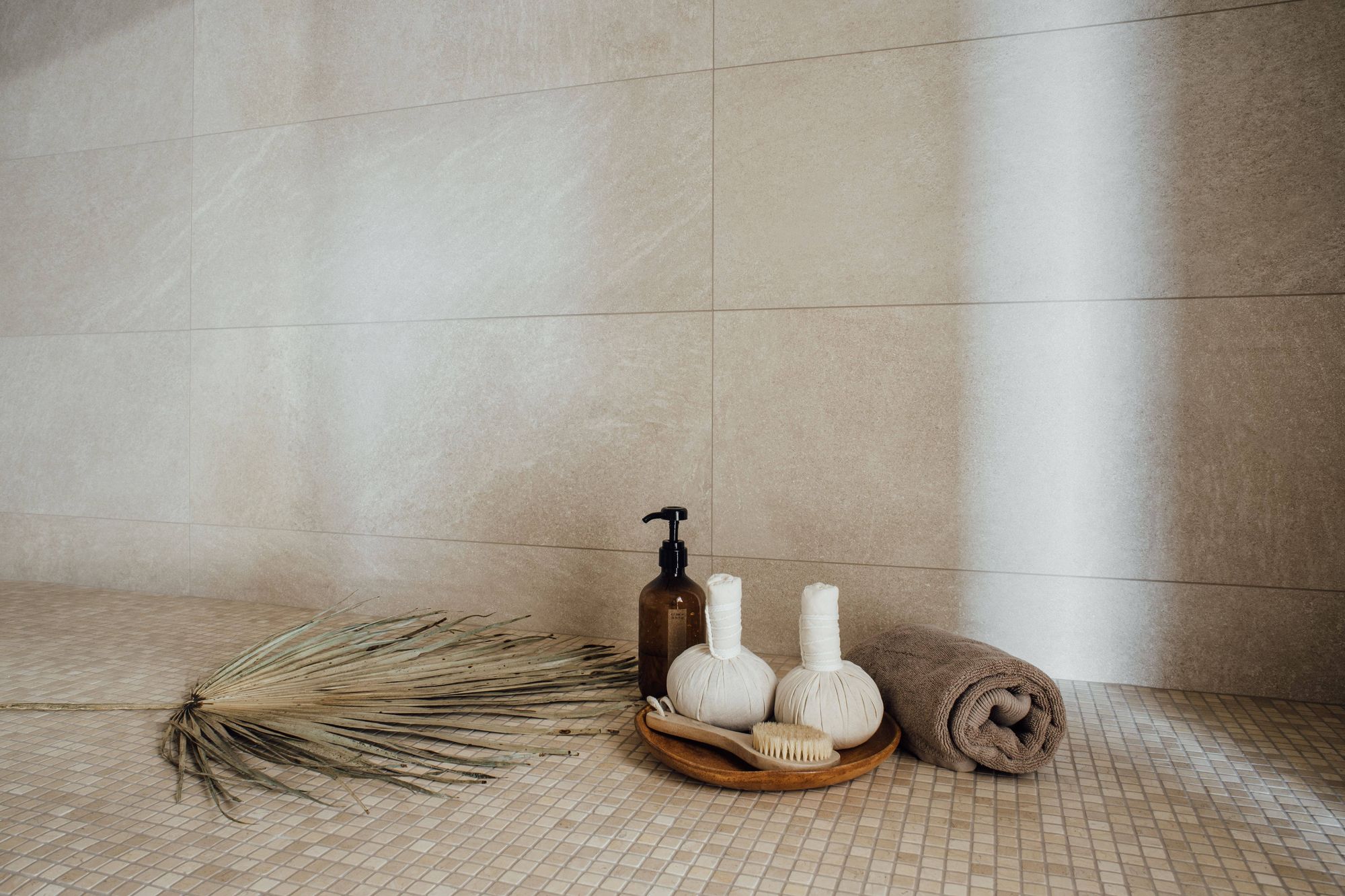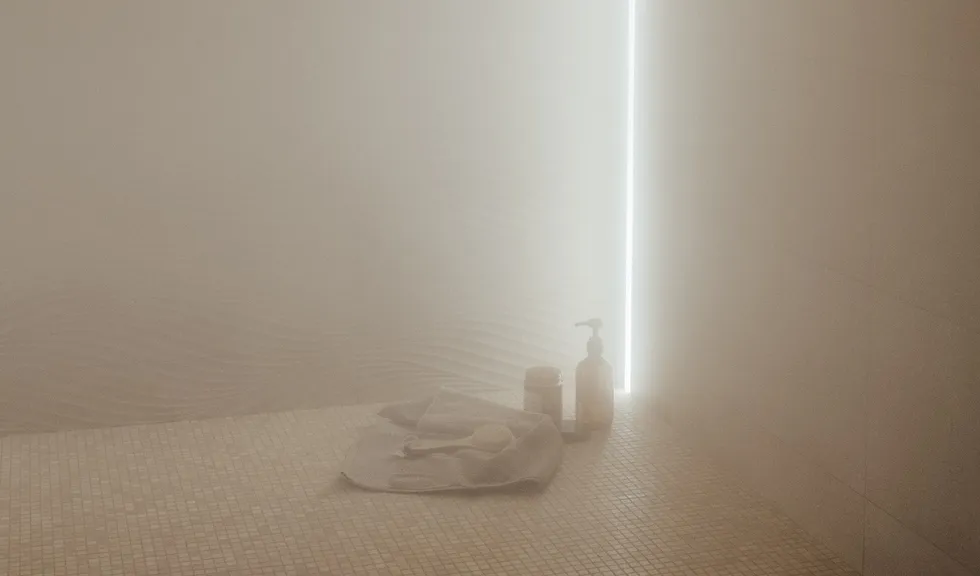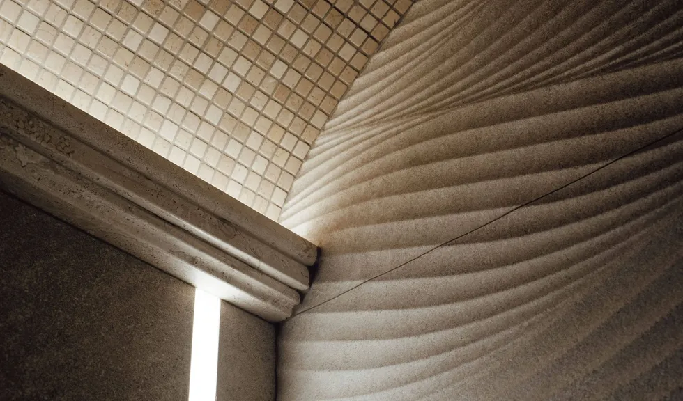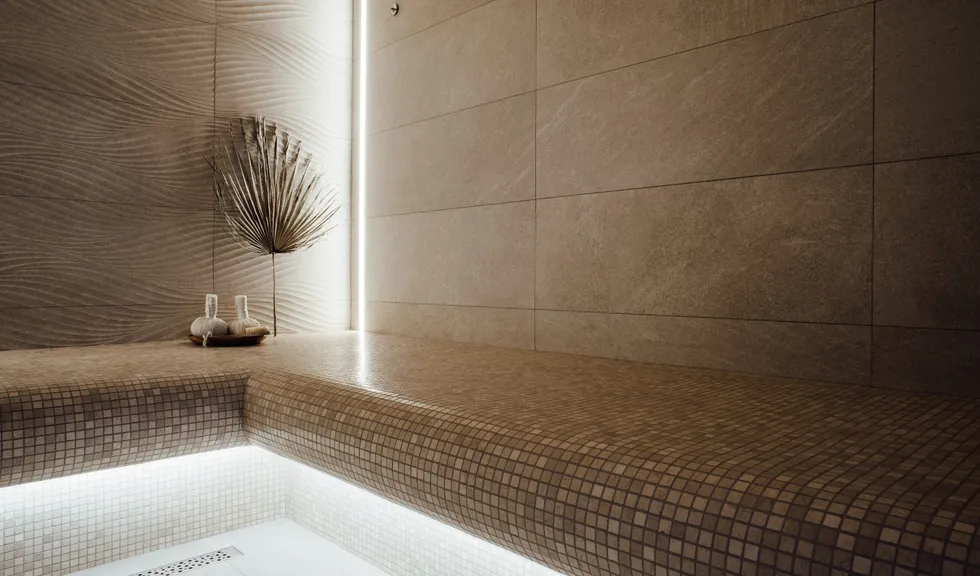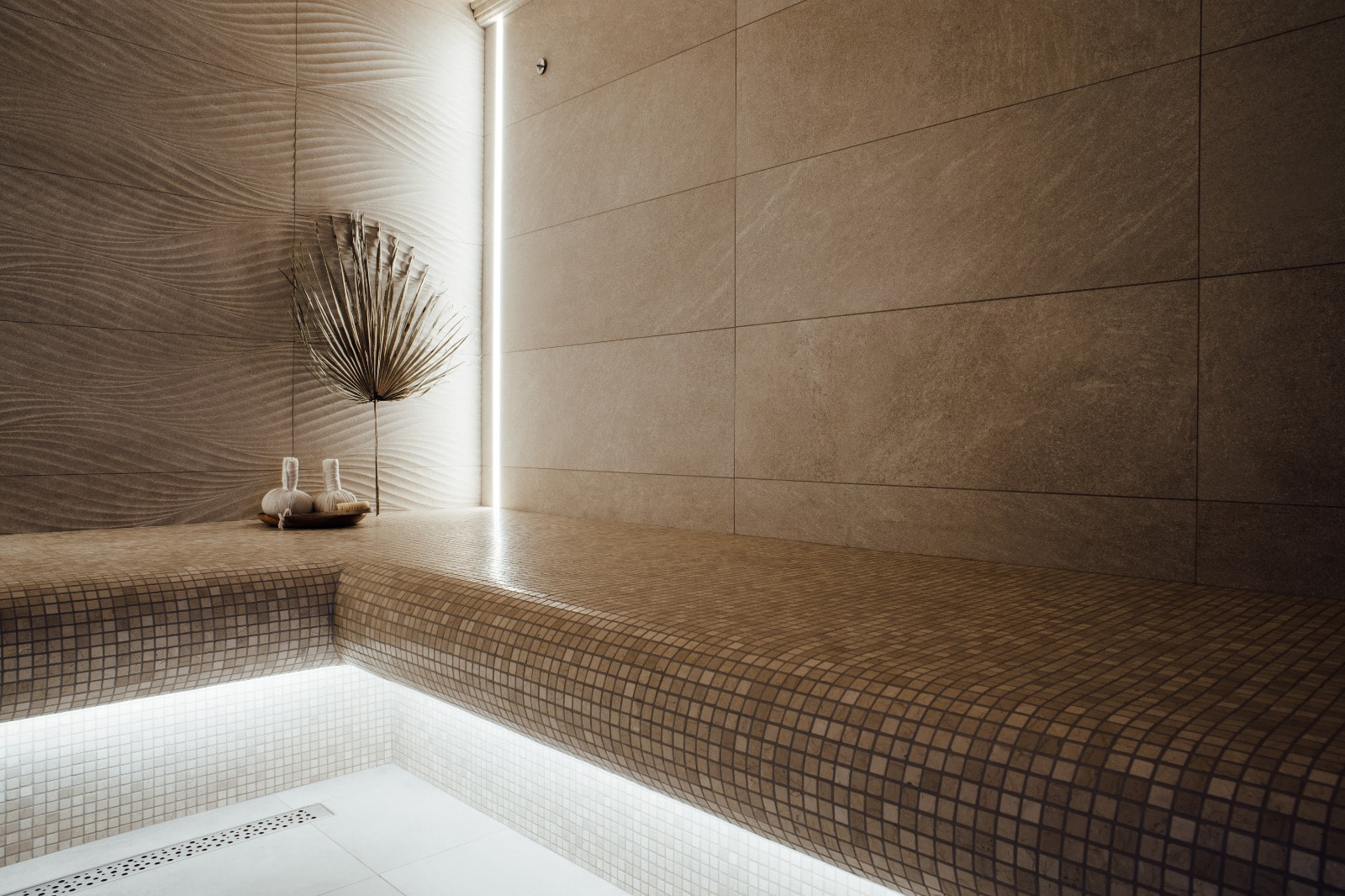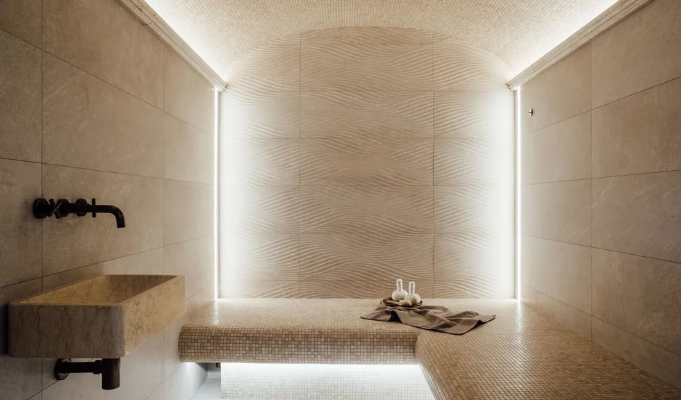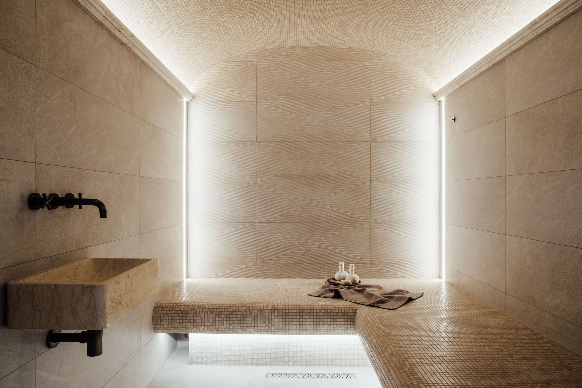 Монохромность и отсутствие ярких цветовых акцентов в интерьере хаммама способствуют созданию умиротворяющей атмосферы. При этом интерьер по-восточному нарядный благодаря сочетанию поверхностей с различной фактурой. На скамьях и сводчатом потолке — мелкая мозаика, а на стенах — гладкая текстура мрамора и рельефные плиты, напоминающие песчаные дюны.