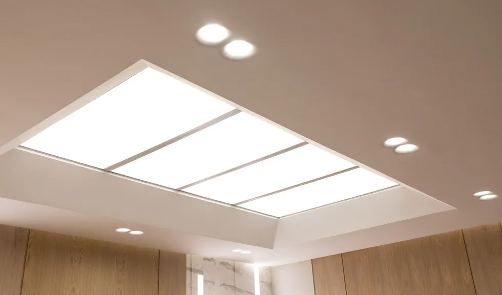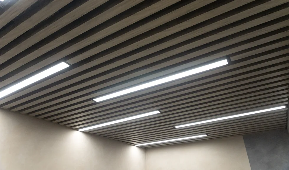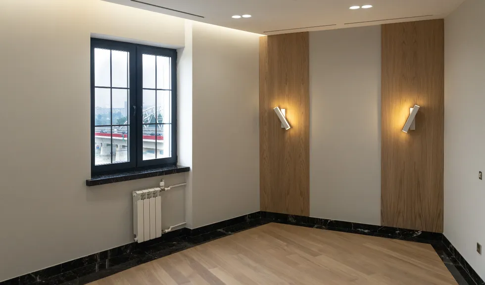 Для данного проекта под заказ были созданы светильники SP LINE на основе профиля разной формы и длины. Прямые линии отлично смотрятся между деревянных реек на потолке и в мраморных панелях, а крупная прямоугольная композиция подчеркивает геометрию комнаты.