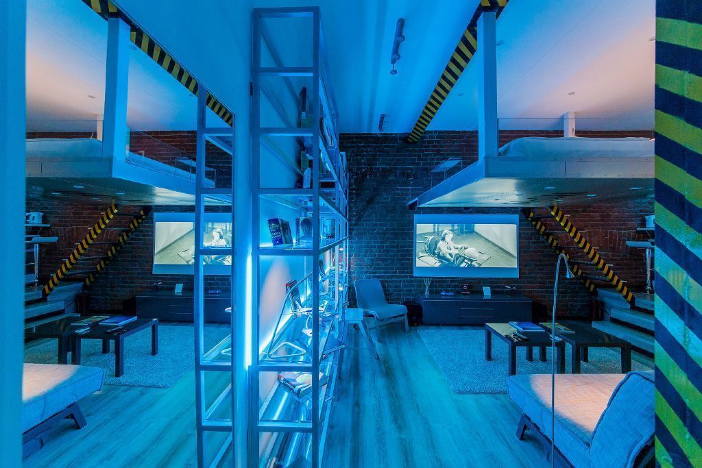 Светодиодная подсветка и светодиодное освещение в квартире-студии дополняет интерьер, выполненный в авиа-тематике.