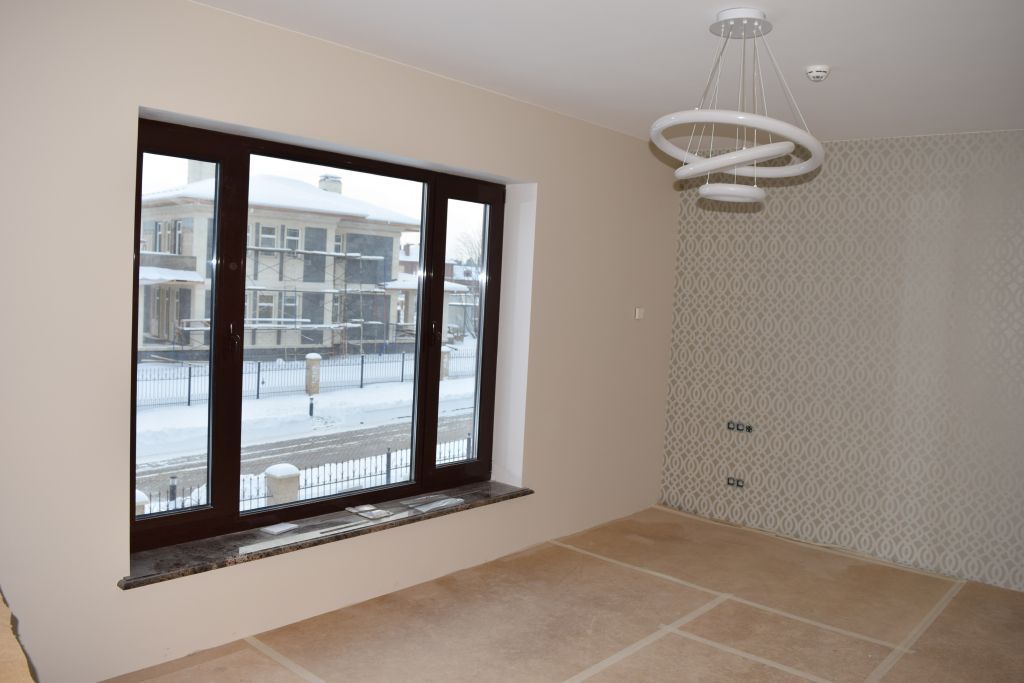 Высота потолка зала в области лестничного пролёта позволила установить объемный светильник, созданный из алюминиевых профилей и подвесов. Подвесы отрегулированы таким образом, что профили находятся на разных уровнях под наклоном. Конструкция получилась объемной, но в то же время лёгкой, что подчеркнуло общий стиль интерьера зала.