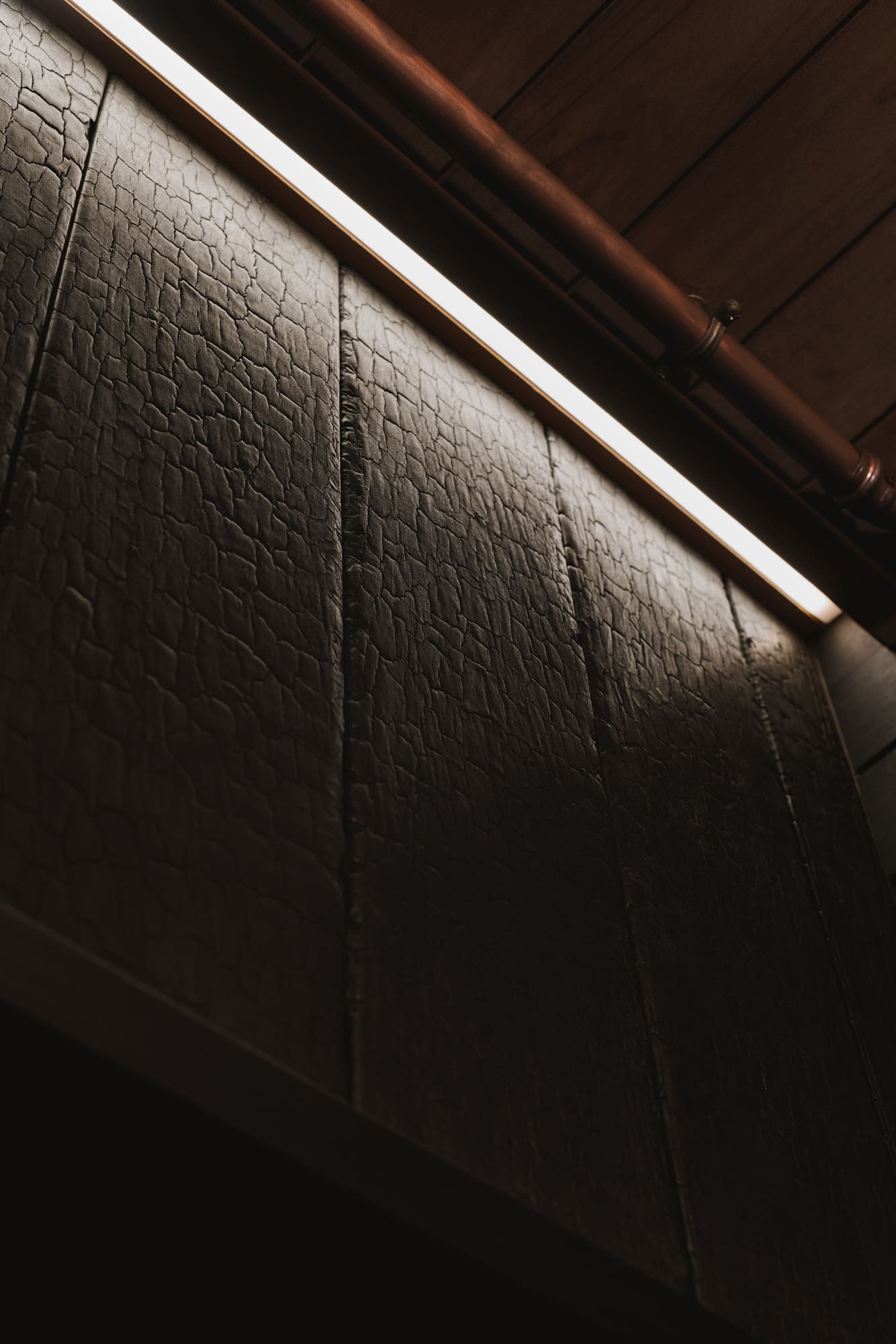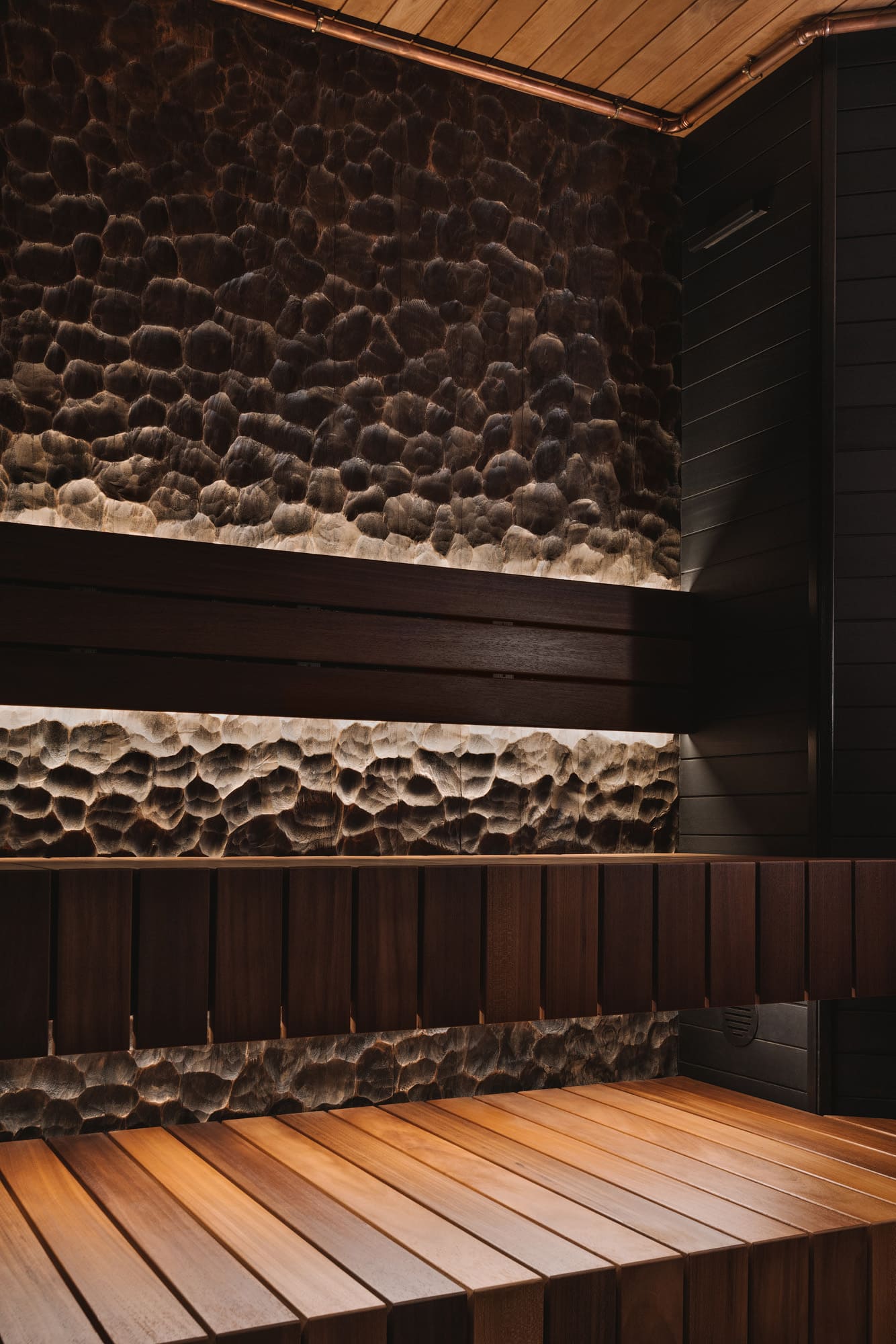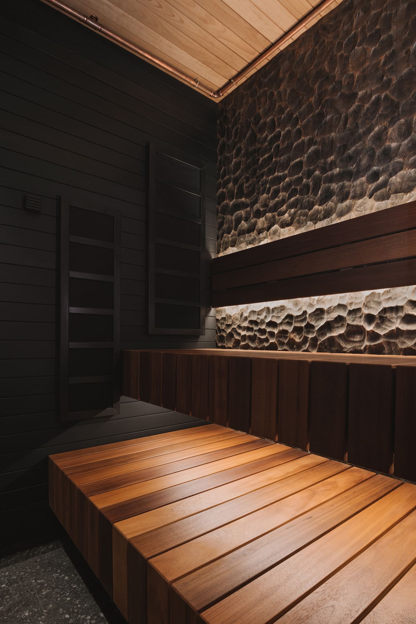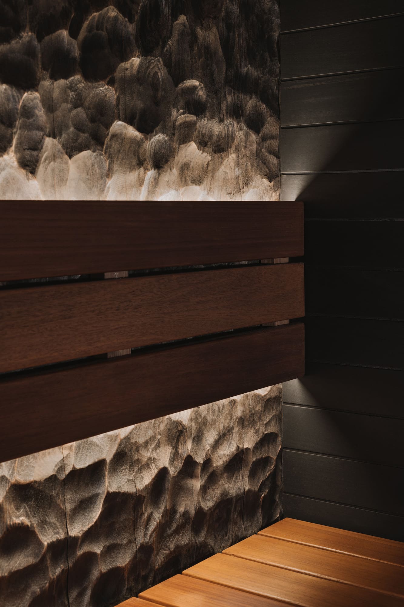Для более расслабляющей атмосферы источники света скрыты от глаз посетителей. Светодиодные ленты установлены в накладные профили SLIM, которые обеспечивают хороший теплоотвод, что особенно важно в условиях высоких температур. Профили с лентами размещены под полка́ми, подспинниками и в пространстве между потолком и стеной. Благодаря этому в сауне создается стильный эффект «парящего» потолка, а также подчеркивается рельеф декоративной панели из обожженной древесины.