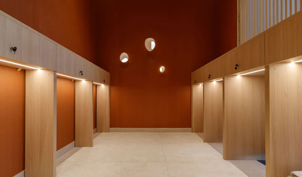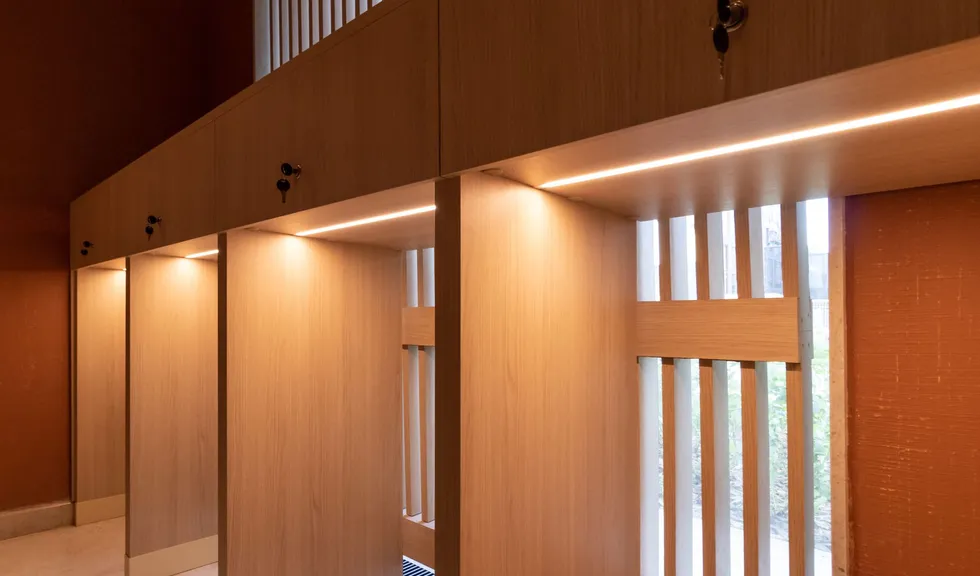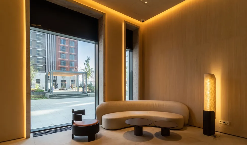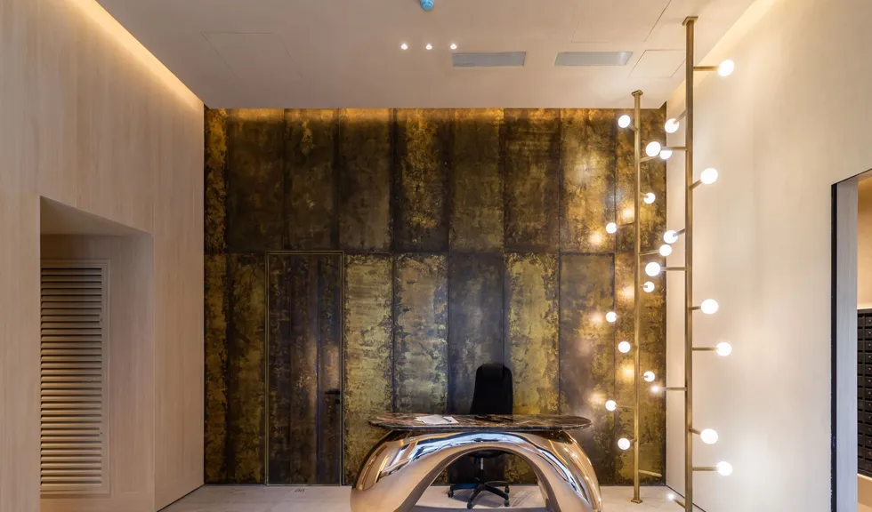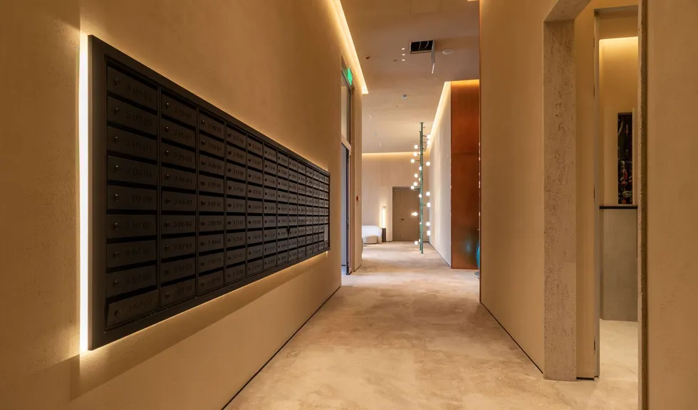 Природная концепция продолжается и внутри зданий. Жителей и гостей комплекса встречает просторное лобби в благородных осенних оттенках. Цветовую гамму помещения усиливают источники света с теплым белым свечением, создавая в лобби уютную и респектабельную атмосферу. Закарнизная подсветка на основе светодиодной ленты и профиля Arlight образует эффект парящего потолка, а также подчеркивает оконные рамы и зону почтовых ящиков. Встраиваемые даунлайты ATLAS, обладающие низким показателем дискомфорта (UGR<16) и небольшим углом излучения (35°), создают ненавязчивый комфортный свет.
