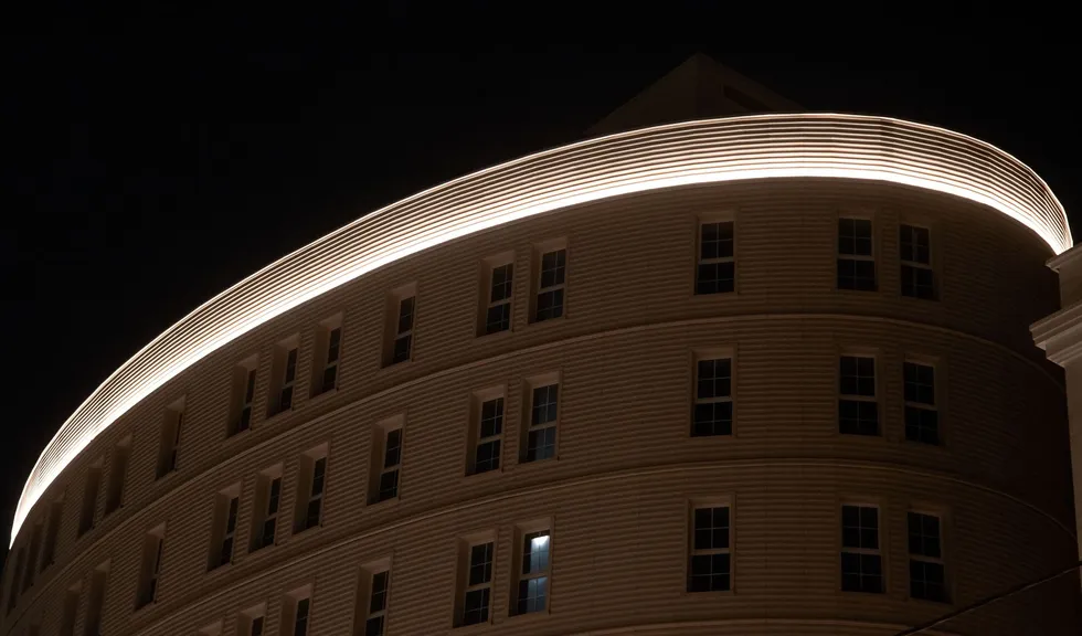 Подсветка фасадов выполнена на основе герметичной светодиодной ленты ARL PV C72 с цветовой температурой 3000 К. Теплый белый цвет свечения создает уютный и умиротворяющий облик здания и хорошо подходит для акцента классических декоративных элементов. Округлый орнамент на фризе оживает в свете подсветки, а рифленая поверхность фасада приобретает объем. Широкая подсветка верхнего и нижнего контура одного из корпусов плавно очерчивает строение в темное время суток.