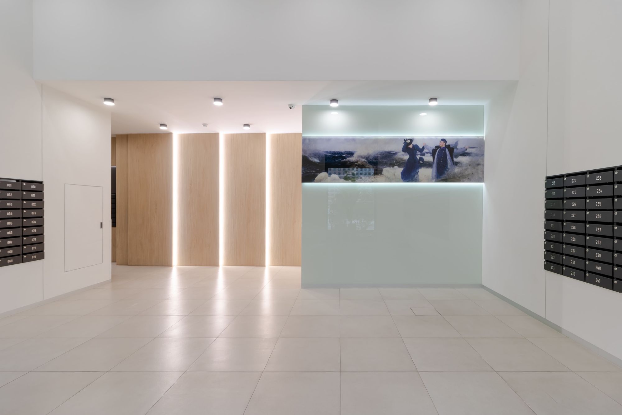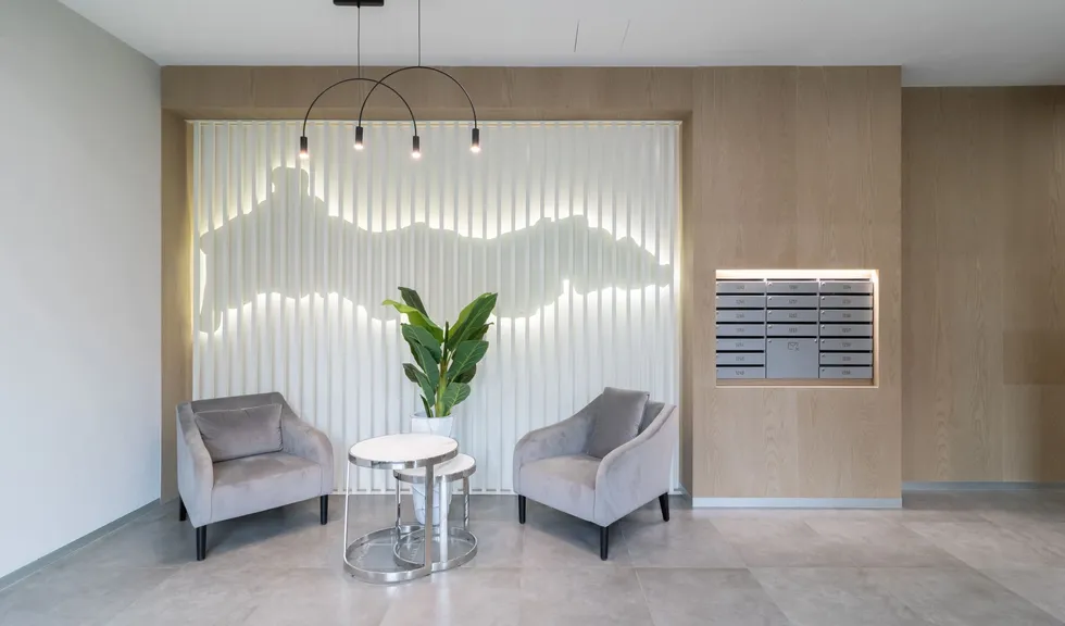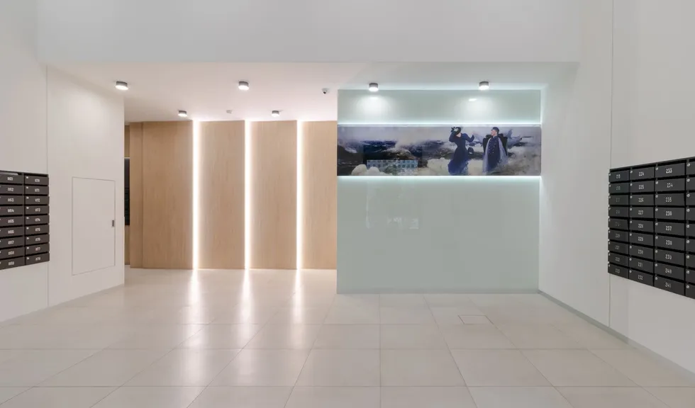 Особый шарм в лобби создается за счет закарнизной подсветки. С помощью накладного профиля SL и светодиодной ленты RT с дневным цветом свечения был сделан акцент на зоне почтовых ящиков и на декоративных элементах, а также была создана вертикальная подсветка деревянных панелей. Благодаря последнему эффекту помещение лобби кажется просторнее, а у жильцов и гостей дома создается ощущение, будто дневной свет проходит сквозь стены.