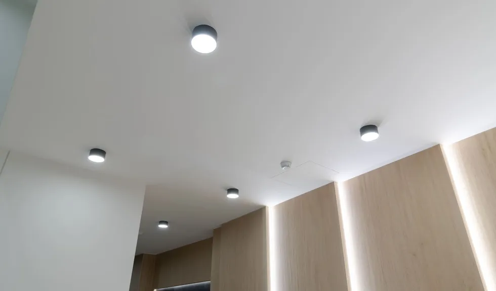 Для создания основного освещения в МОП активно применяются накладные светильники RONDO. Они обладают высоким индексом цветопередачи (CRI>90), что позволяет точно передавать цветовую гамму окружающих предметов. Благодаря матовому рассеивателю из поликарбоната получается мягкое и комфортное для глаз свечение, которое не образует резких бликов. В целом места общего пользования выполнены в черно-белой цветовой гамме и частично отделаны светлым деревом: цилиндрические светильники RONDO в черном цвете гармонично вписываются в пространство.